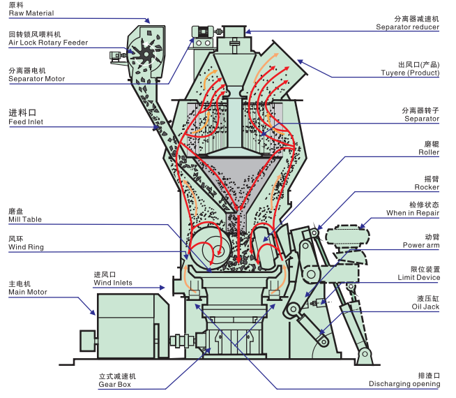 工作原理:電動機通過減速機帶動磨盤轉(zhuǎn)動,物料從進料口落在磨盤中央,同時熱風(fēng)從進風(fēng)口進入磨內(nèi)。在離心力作用下,物料向磨盤邊緣移動,經(jīng)過磨盤 上的環(huán)行槽時受到磨輥的碾壓而粉碎,粉碎后的物料在磨盤邊緣被風(fēng)環(huán)處高速氣流帶起,大顆粒直接落到磨盤上重新粉磨,氣流中的物料經(jīng)過動靜態(tài)分離器時,在旋轉(zhuǎn)轉(zhuǎn)子的作用下,粗粉落在磨盤上再次粉磨,合格細粉隨氣流一起出磨,在收粉裝置中收集,即為產(chǎn)品。含有水分的物料在與熱氣體的接觸過程中被烘干,達到所要求的產(chǎn)品水分。
